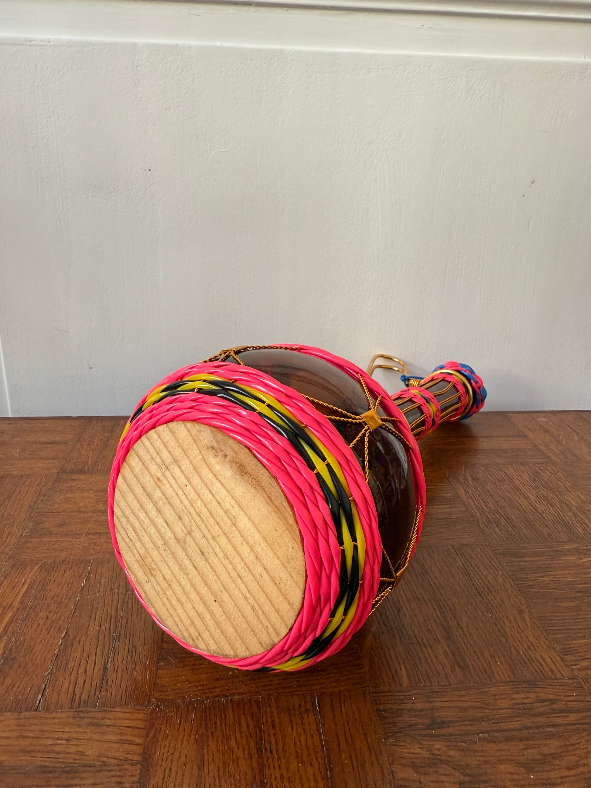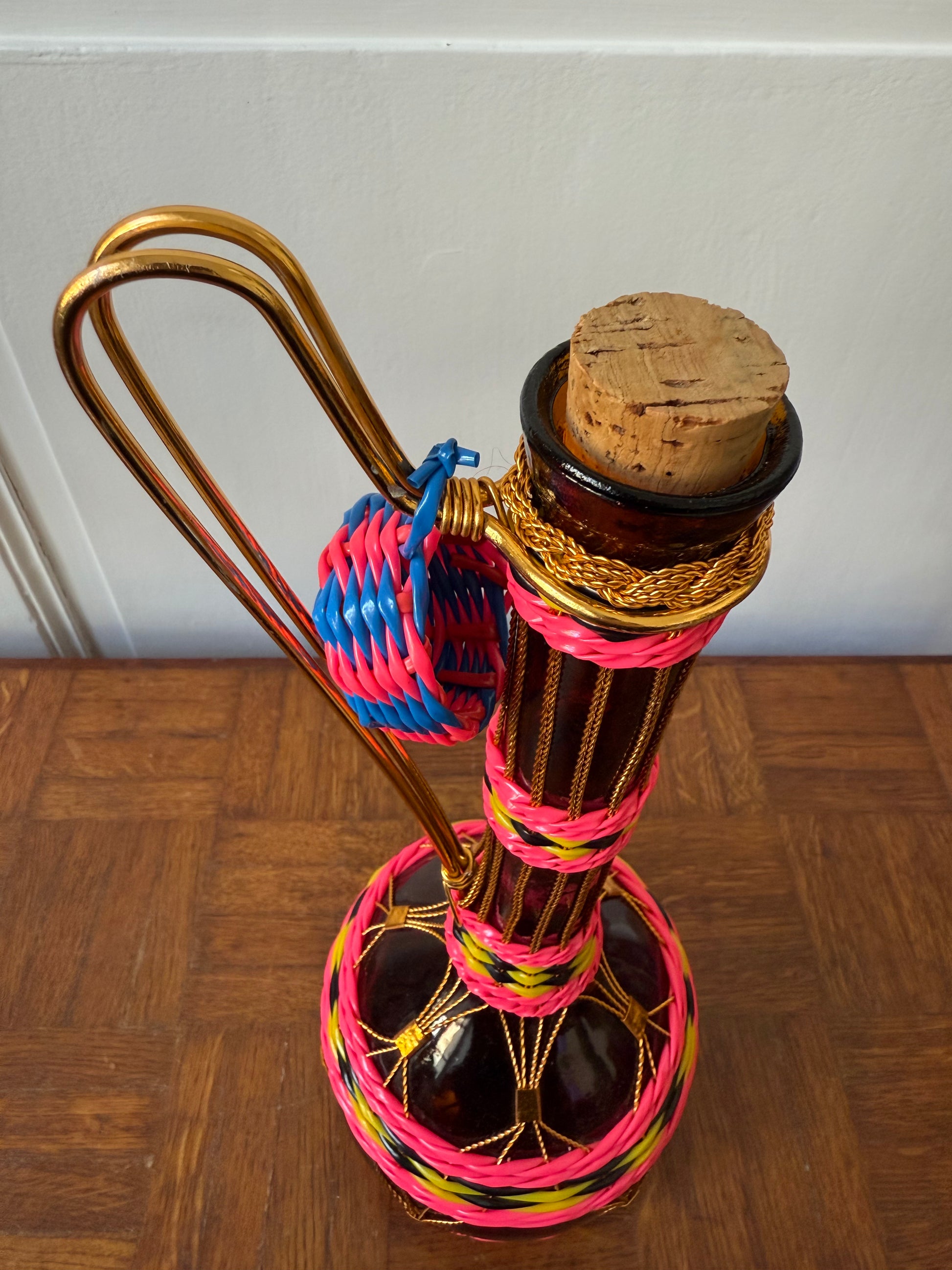 Cette bouteille scoubidou est un vrai concentré de couleur et de bonne humeur. Enveloppée de cordons en plastique tressés aux tons vifs autour d’un verre brun profond, elle allie originalité, artisanat et style rétro à la perfection.