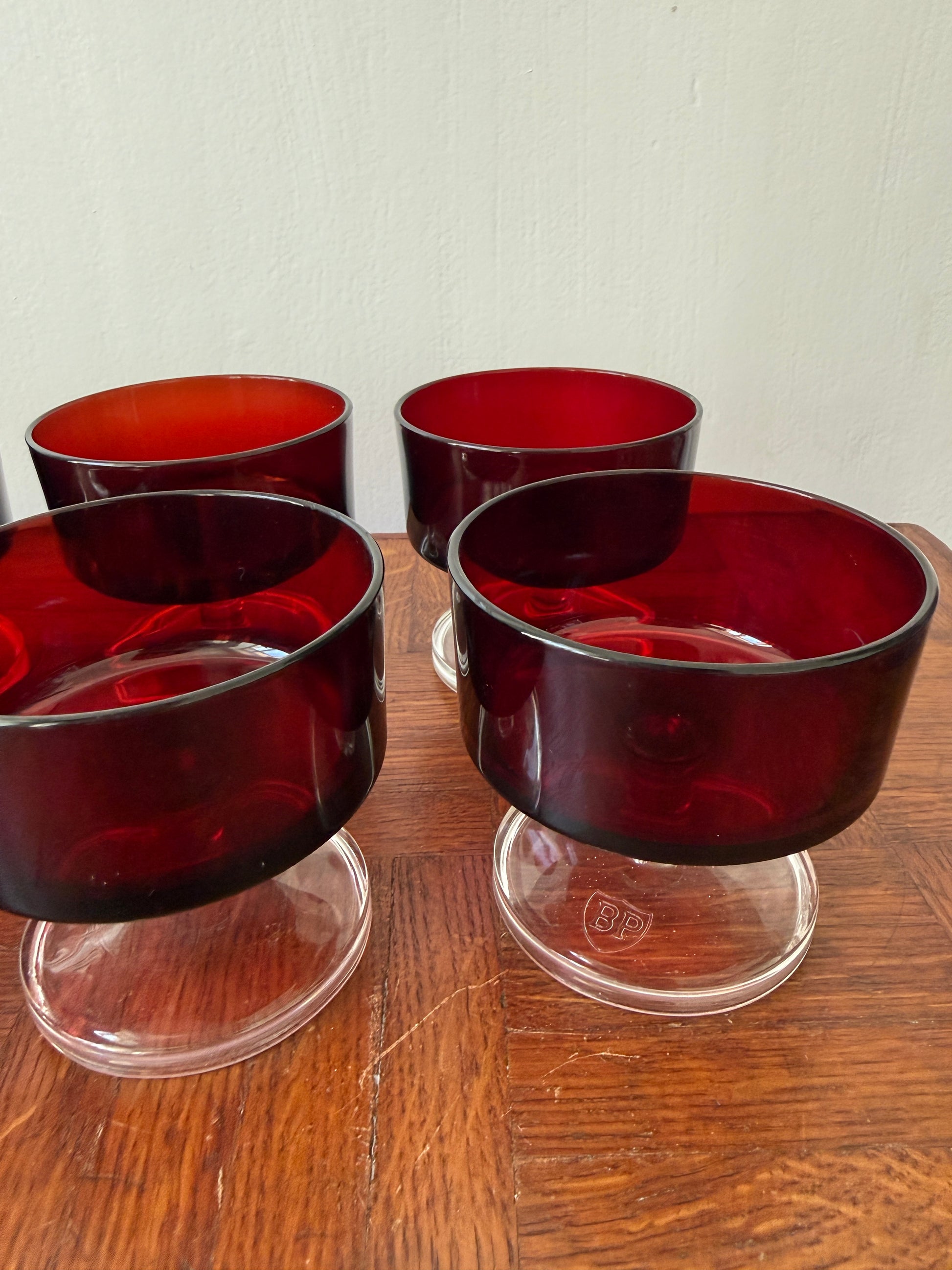 Ce lot de 8 coupes à champagne Luminarc ont été fabriquées en France dans les années 70. Le modèle Suède et leur teinte rouge rubis intense, contrastée par un pied transparent, apporte tout de suite une note chic et rétro à ta table.