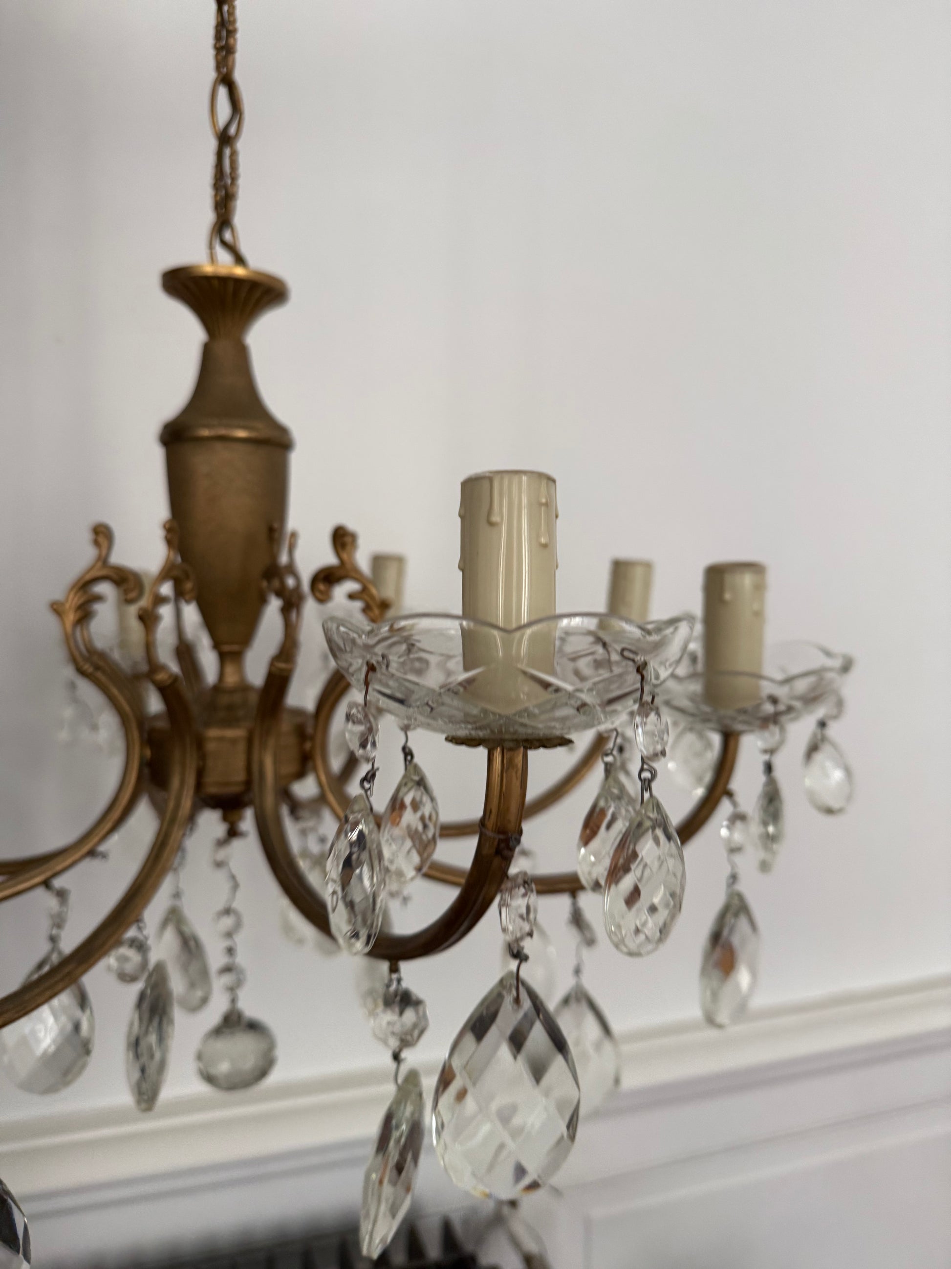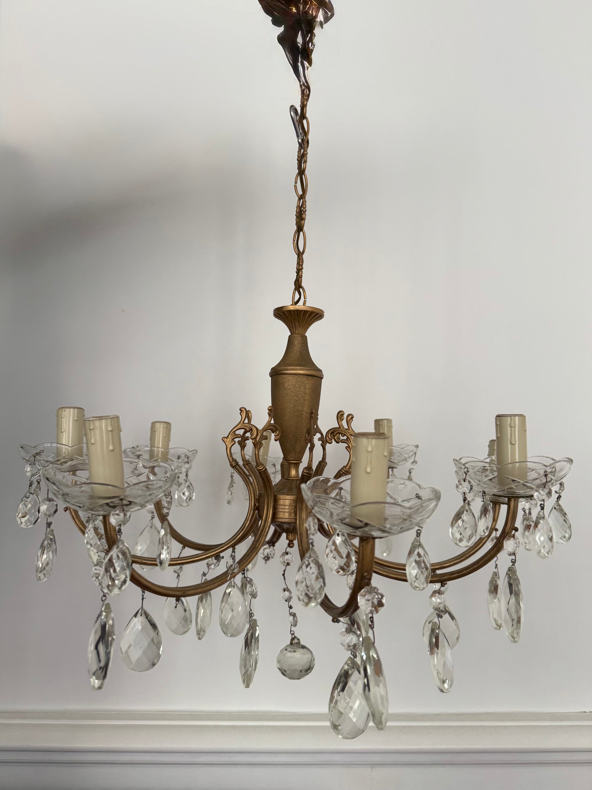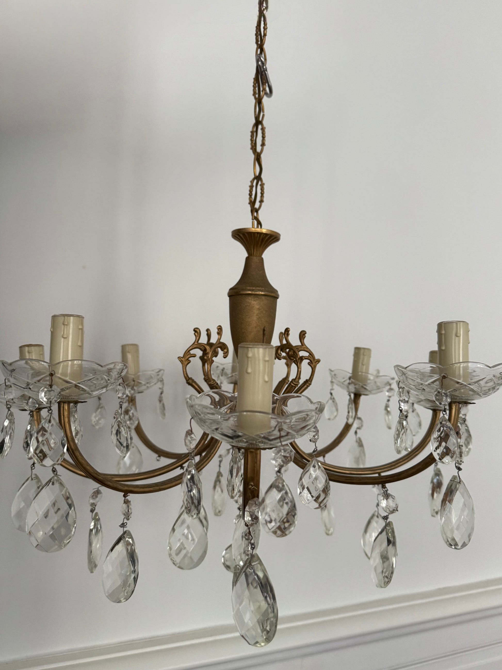 Ce lustre en laiton orné de pampilles en cristal est une véritable pièce maîtresse qui attire le regard et transforme instantanément une pièce.