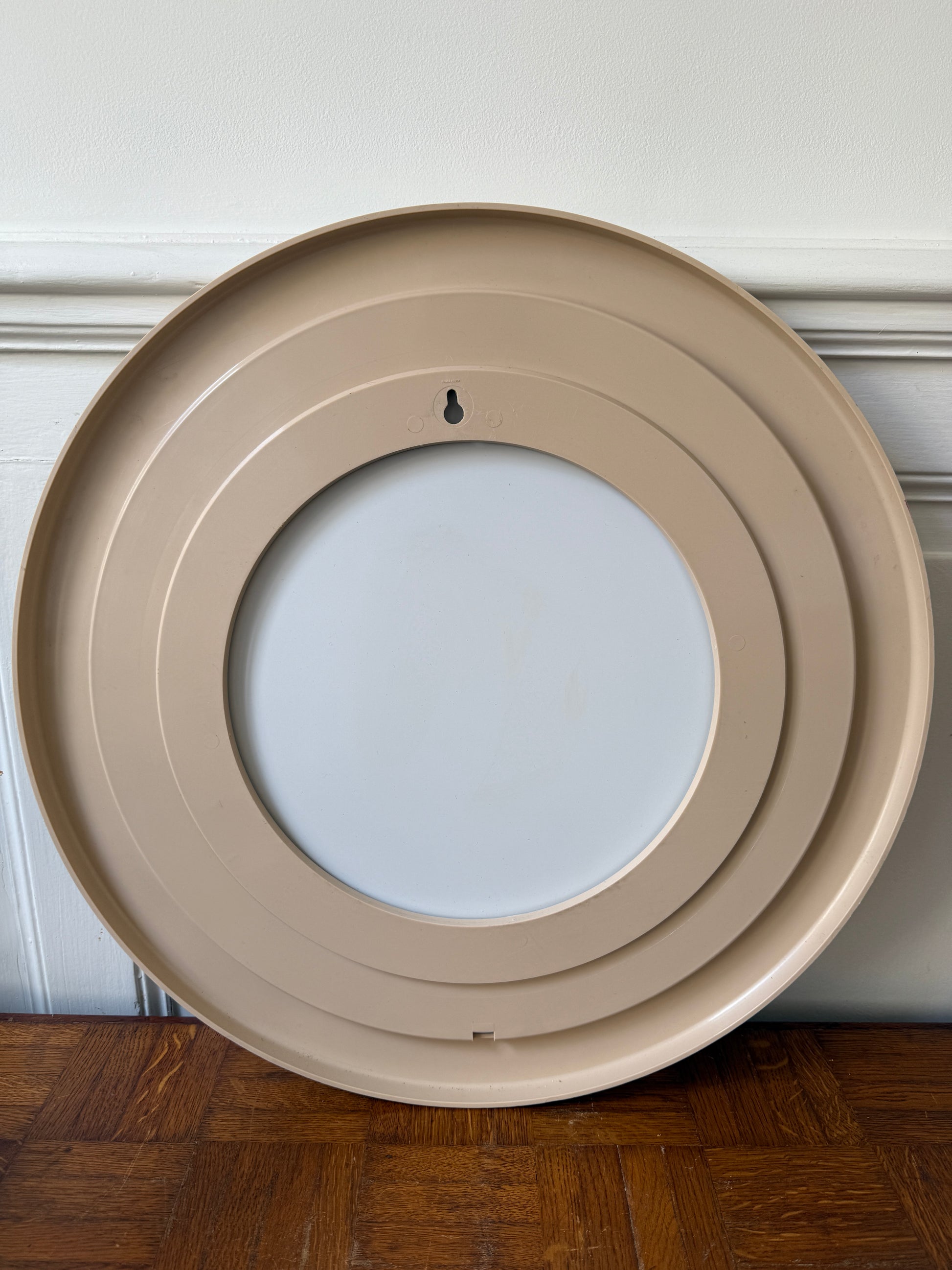 Icône des années 70, ce miroir rond en plastique beige coche toutes les cases du vintage cool. Son design minimaliste et sa teinte douce apportent une touche rétro pile dans l’air du temps, facile à intégrer aussi bien dans un intérieur vintage que contemporain.